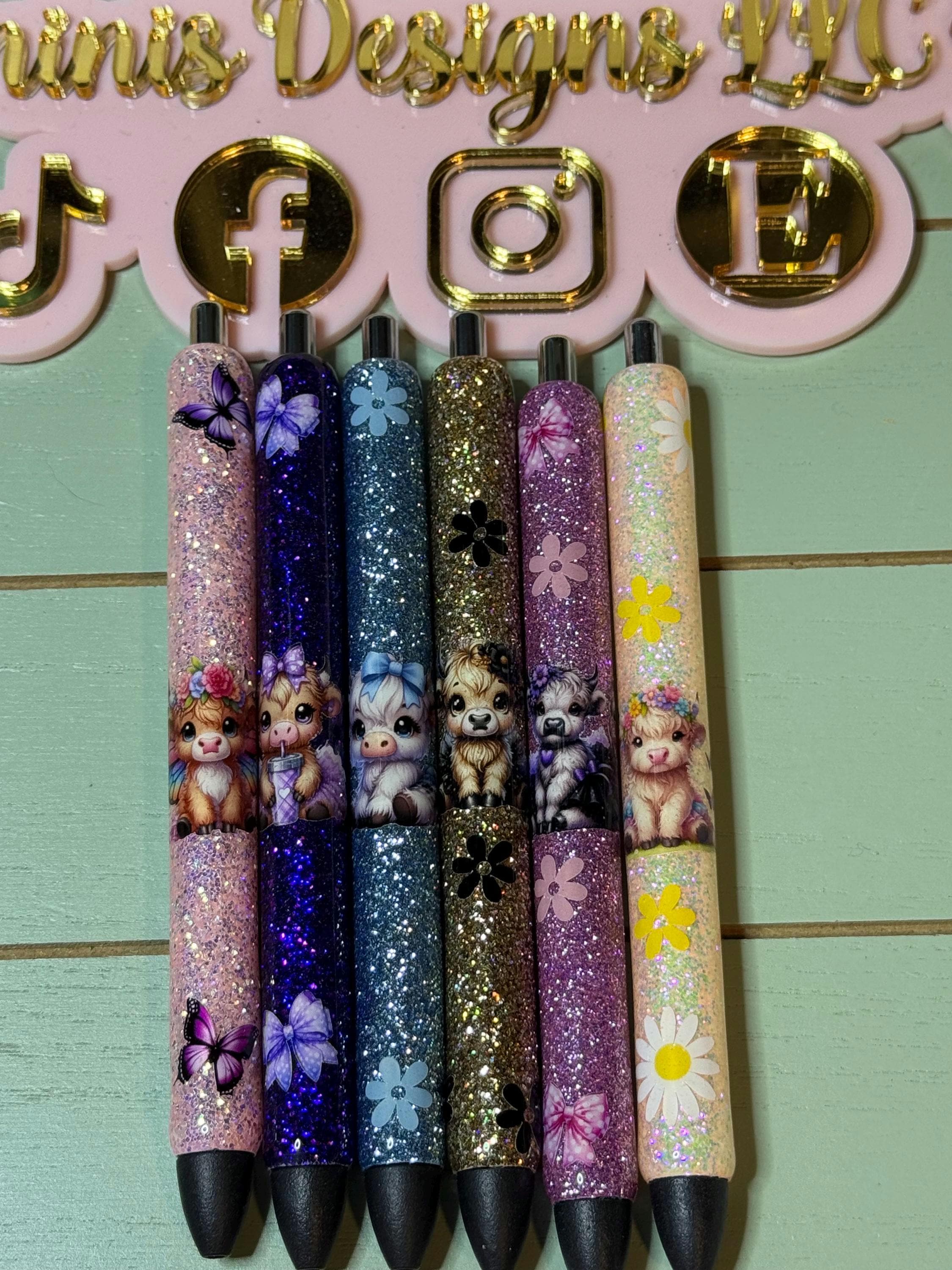 Beautiful glitter pens with ballerina cows and flowers. each color pen will be created with the design pictured. if you want to switch it up you will need to contact me prior and this way we ensure that the pen is made correctly